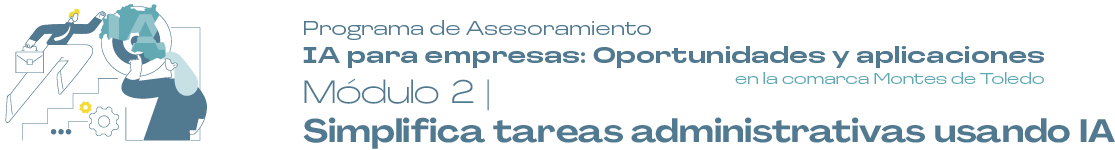 Inicio 5 Programa de Asesoramiento 4 5 Módulo 2: Simplifica tareas administrativas usando IA Volver atrás Módulo 2 Recursos del Módulo Contenido teórico Acceder Podcast Acceder Ejercicio práctico Acceder Lecturas complementarias PCómo Aplicar la IA en tus Tareas Administrativas P8 Procesos que se Pueden Automatizar con IA PImpulsa tu departamento de administración con IA: aumenta eficiencia y reduce costos PLa IA y el futuro del trabajo: tendencias y estadísticas Vídeos complementarios PCómo usar ChatGPT para redactar: Correos y solicitudes - Curso de ChatGPT P¿Qué es la inteligencia artificial? PConvierte Excel en una Herramienta de IA con ChatGPT